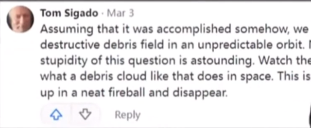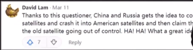 看到这名印度网民如此冥顽不灵,一名中国网友表示,如果按照印度网民的想法,那是不是也意味着中俄两国用那些旧卫星撞向美国卫星了呢?