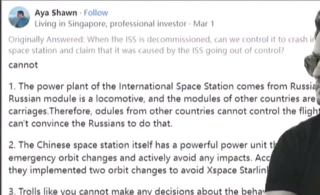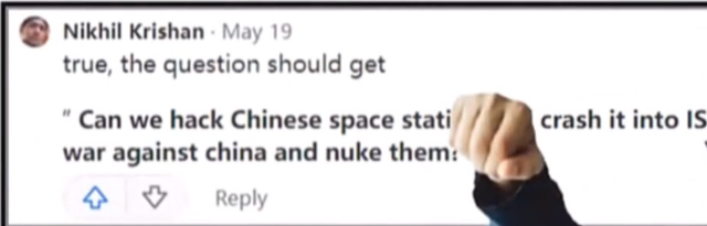 其中一名印度网民就在美版知乎上表示,到时候能不能让退役的国际空间站直接撞向中国空间站呢?
